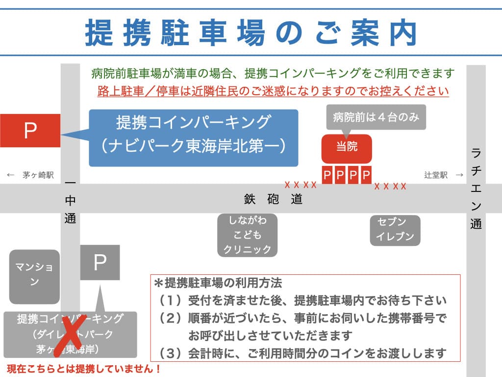 コロナ禍以降、お車での来院が増えてきており、駐車場が足りなくなるケースが増えてきております。路上での無断停車・駐車は近隣住民のご迷惑となりますので、おやめください。提携のコインパーキングもご利用可能な他、受付後、診察の順番が近づいたときに携帯などにご連絡させていただくこともできます。