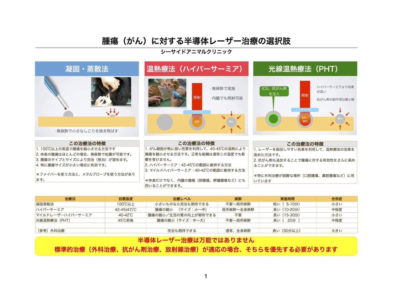 ・体表の良性腫瘍が対象となります。悪性腫瘍(いわゆるがん)に対しては、3大治療である外科療法、放射線療法、化学療法を優先する必要があります。