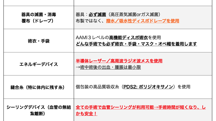 器具の滅菌、無菌手術環境の徹底、高品質縫合糸(ポリジオキサノン)および高周波ラジオ波メスや半導体レーザーなどのエネルギーデバイスを使用しています