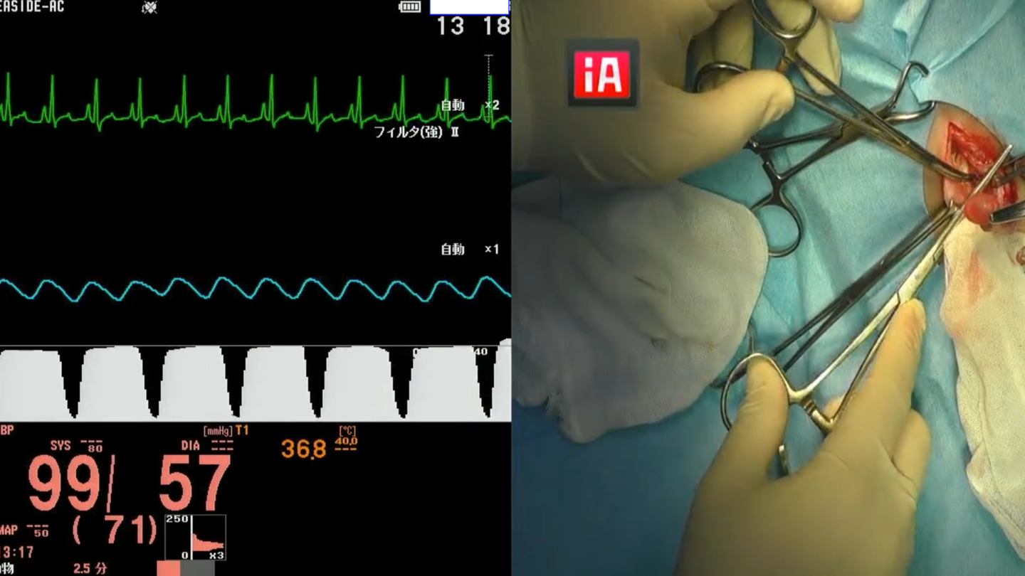 手術中は麻酔モニターと手術野の2画面表示で監視しています。