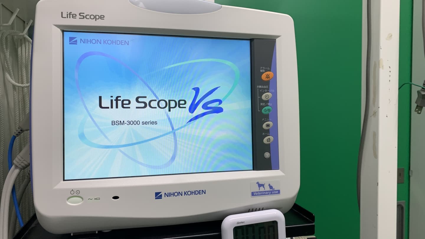 必ず獣医師が麻酔医として常駐し、可能な限り細やかな麻酔モニタリングを実施。2画面表示モニターを用いた。術野・麻酔監視も行っています。